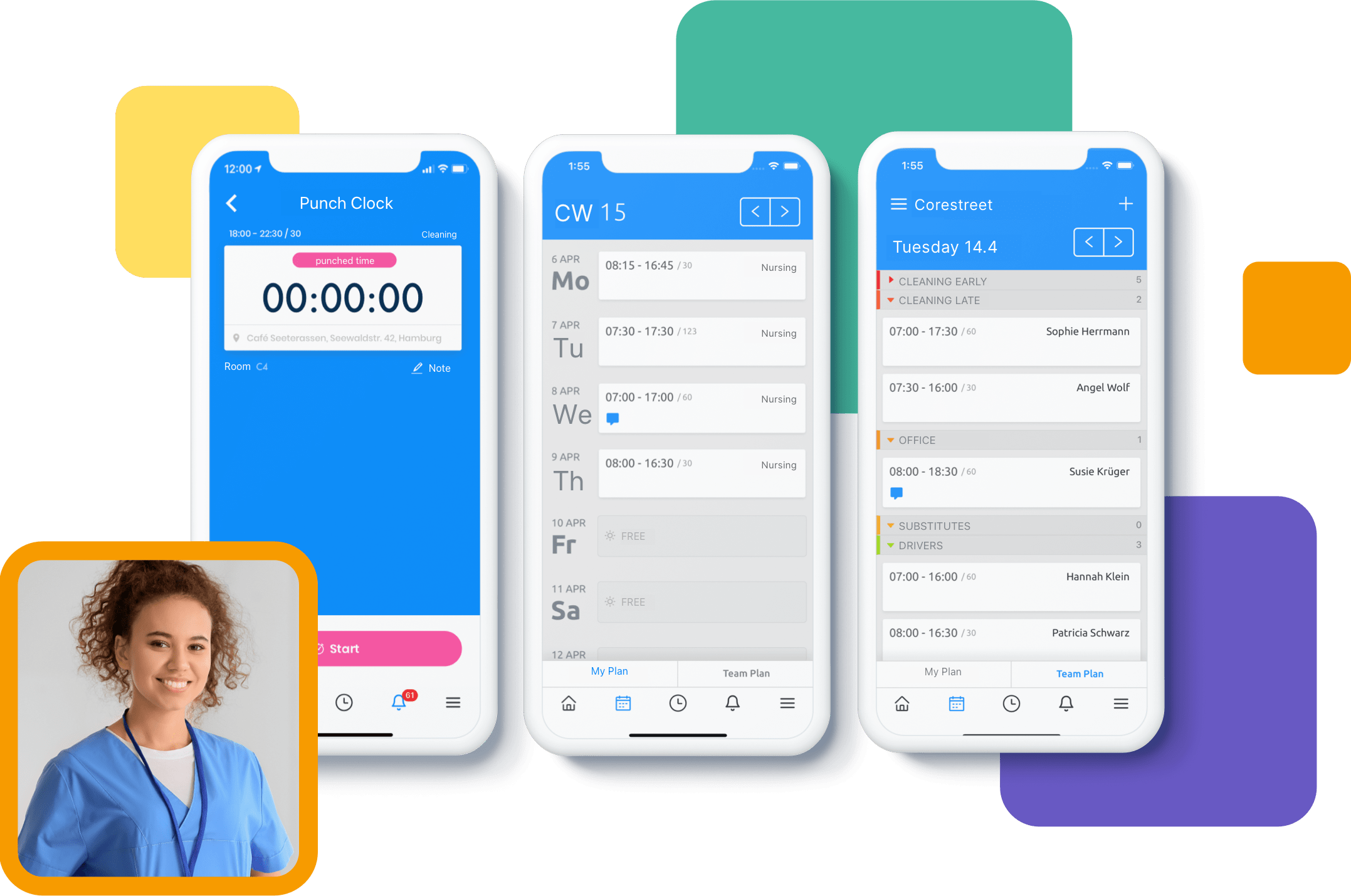 Integrate the digital punch clock into the operational process of your nursing service. The system allows your nurses to clock in and out for shifts at any time via the smartphone app. Additionally, the automatic analysis of shift data in the hourly account leads to more efficient management of your employees' working hours.